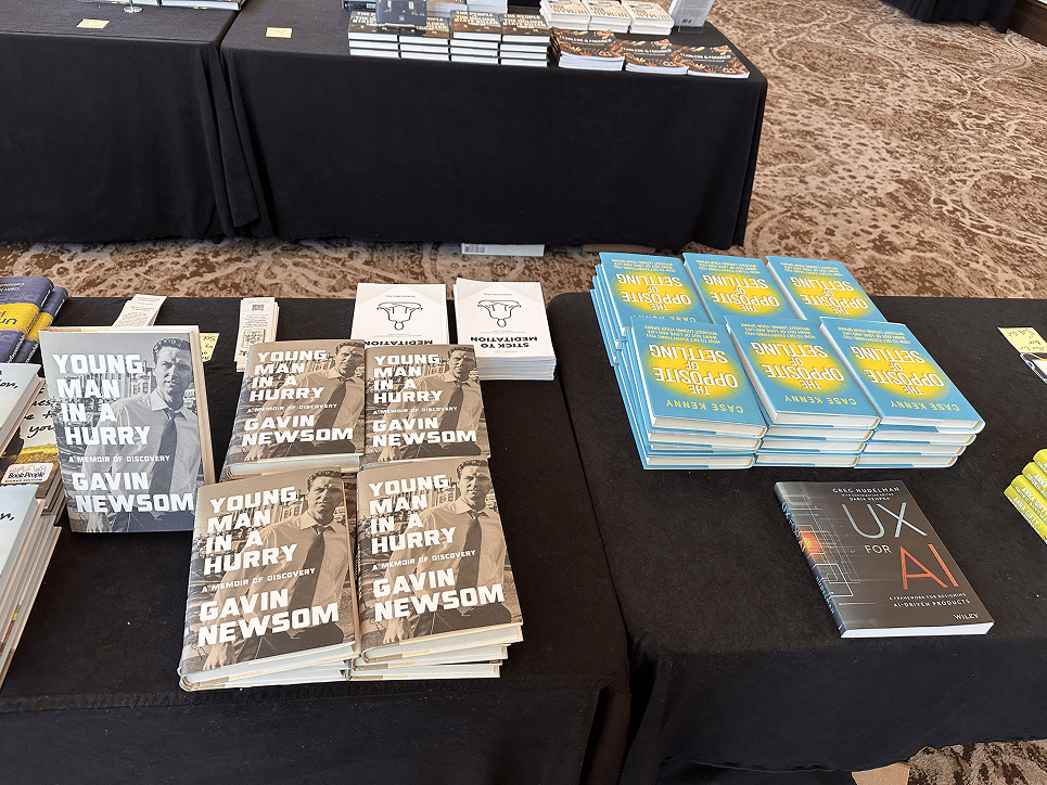 One book left on the table by the end — and that's the one we got to sign. (It was next to Gavin Newsom's. His stack didn't move. Just saying.)