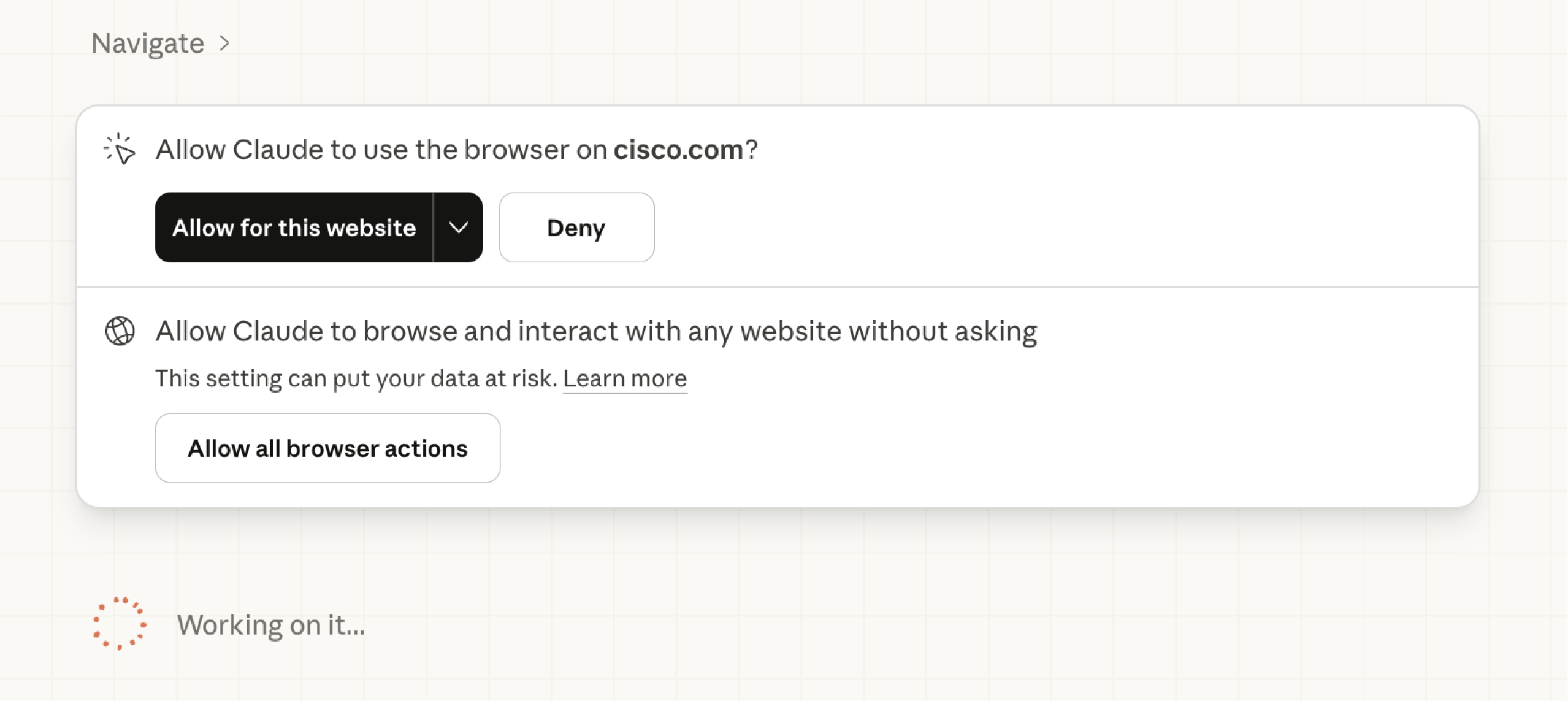 That's it. That's the entire informed consent model for an AI agent about to operate inside one of the world's largest networking and security companies' web presence. No specification of what actions it plans to take. No disclosure of which credentials it might touch. No indication of whether it's reading a public product page or interacting with a logged-in partner portal. Just: allow or deny.